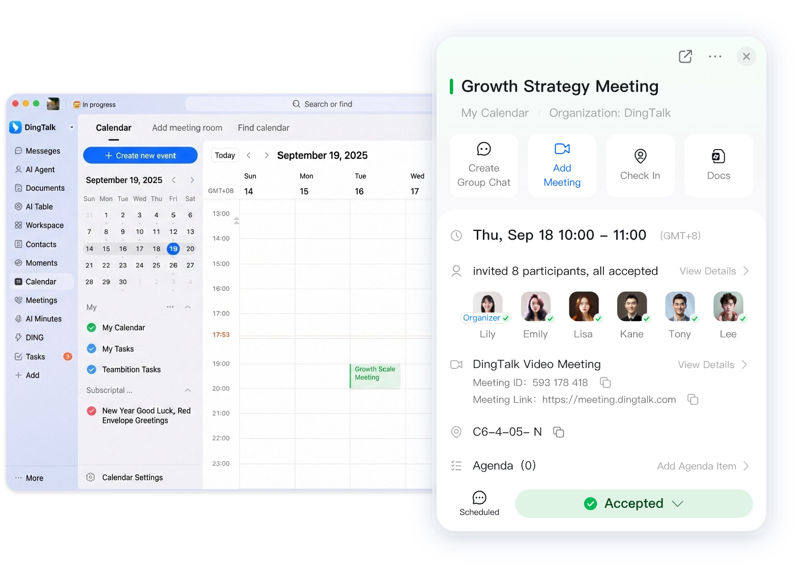 By integrating DingTalk group chats, voice and video calls, meeting rooms, Flash Meetings, and attendance tracking, we provide a one-stop meeting solution.